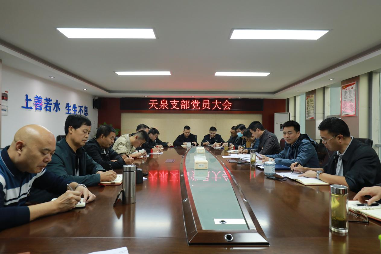 2022年10月27日下午,天泉支部在公司4樓會議室召開支部黨員大會,傳達學習黨的二十大和黨的二十屆一中全會精神,深刻學習領會習近平總書記重要講話精神。會議由支部書記鐘洪勇主持,全體黨員、入黨積極分子參加。