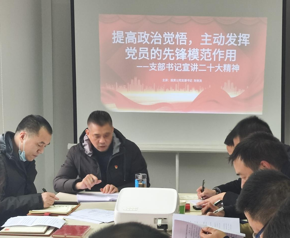 為深入學習黨的二十大精神,強化支部黨員政治站位,進一步樹立黨員先進模范意識,2022年12月6日,投資公司支部召開黨員大會,由支部書記劉世洪講授專題黨課,宣講黨的二十大精神。