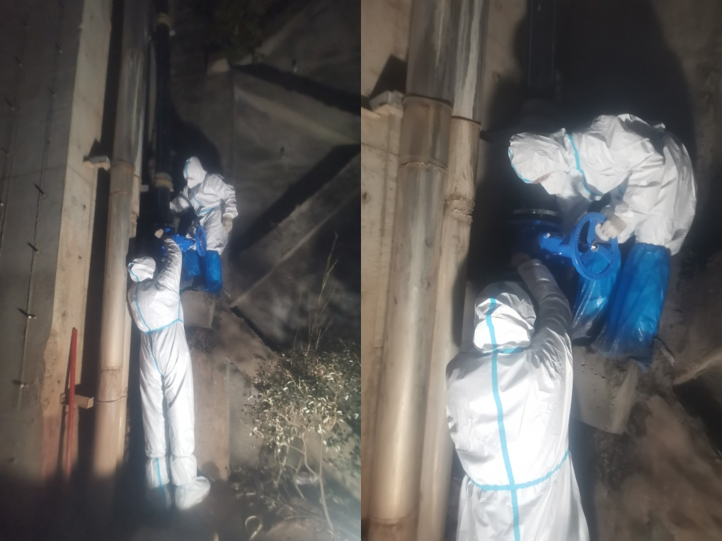 在了解情況后,臨港公司迅速部署,派出共產黨員服務大隊三江新區分隊副隊長涂雁兵帶領兩名年輕同志王時俊、肖瀟前往搶修,在做好自身防疫防護措施后,搶修人員攜帶好工器具,迅速趕往故障現場。到達爆管現場后,經勘查發現,該區域水管閥門上一PE160法蘭頭已與水管斷開,且法蘭頭出現破裂,由于爆管位置特殊,為盡快完成搶修任務保障院區供水,搶修人員根據爆管位置及管道走向,有針對性地制定了搶修方案,并迅速投入搶修。搶修過程中,由于防護服氣密性較高,平時得心應手的維修操作,在此時也變得異常艱難,悶熱的防護服讓搶修人員汗流浹背,衣服濕透,但他們全然不顧,全身心進行搶修工作,最終圓滿的完成了搶修任務,在最短時間內恢復了院內正常供水。離開現場前,搶修人員再次進行全面消殺,保證疫情防控工作安全有序。